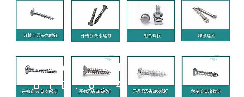 (鐵板牙自攻螺絲) B-2: Plastic Tapping Screw. (塑膠用,自攻螺絲) C: Wooden Screw : 木工螺絲 D: Drywall Screw :水泥墻螺絲 E: Self Drilling Screws鉆尾螺絲(不銹鋼鉆尾螺絲,復合材料鉆尾螺絲) F:膨脹螺絲,四片膨脹螺絲又名:四片壁虎。 膨脹螺栓的等級分為:45、50、60、70、80, 膨脹螺絲的材料: